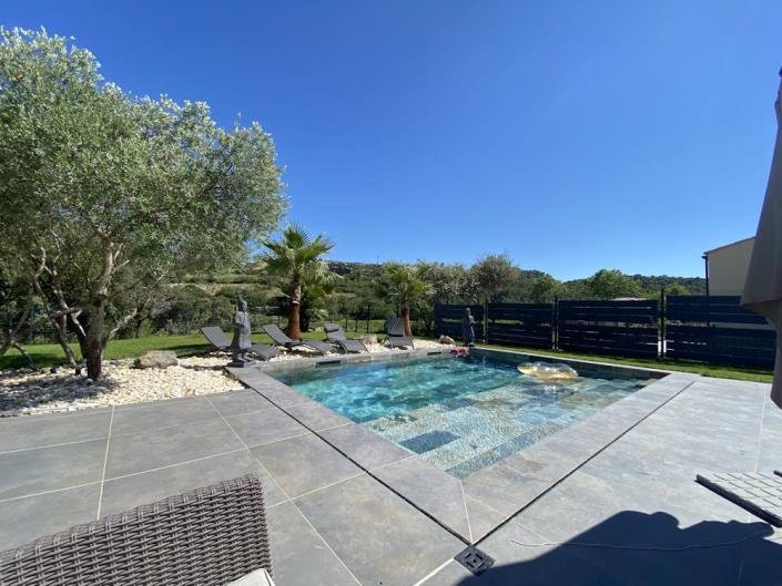 Superb villa built in 2021 of about 125 m² of living space on 2 levels offering a large living room with open kitchen, 4 bedrooms including a large master suite with dressing room and shower room, 1 shower room, 2 WCs. Set within a landscaped and wooded garden with a magnificent swimming pool, a summer kitchen with wood-burning oven and barbecue as well as a Petanque court, plus some magnificent views to enjoy while you relax in your new home.