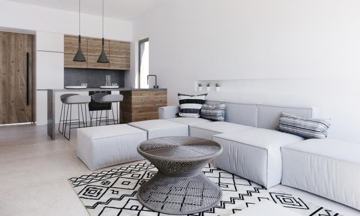 The Design follows a modern inspiration of Cycladic Style, a mixture of natural stones and white-washed walls.