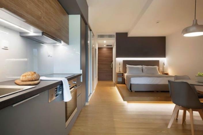 It is only a breath away from the main Court of offices and benefits from secured parameters. It is also a central area for students and young professionals, who can have easy access to top universities, shops, parks and sporting facilities nearby. This unique mixed-use development is comprised of 54 contemporary serviced apartments. It is ideally located in the center of Athens, right by Pedio Areos Park and the main Court of Justice.