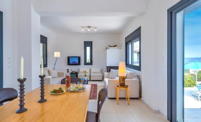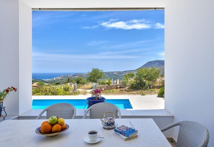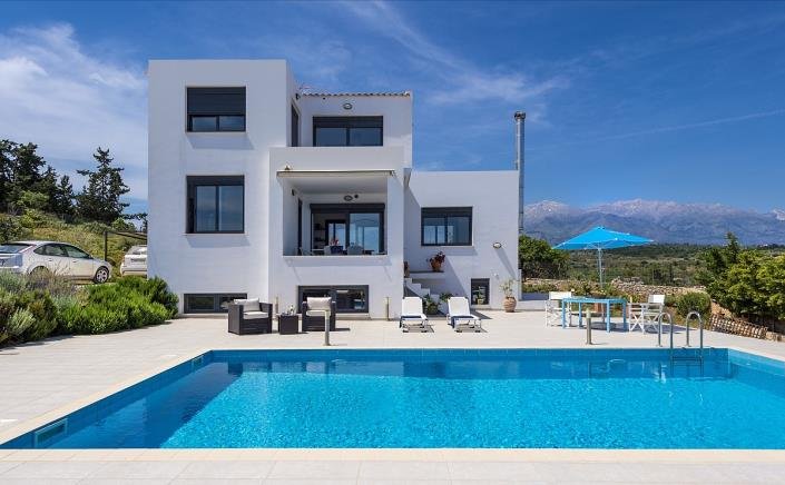 This is a lovely villa in Chania Crete, set on a private land plot of 2500 sqm, with beautiful views of Aegean sea and White Mountains of Crete.