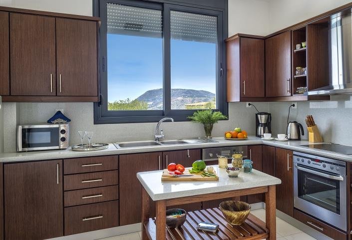 The villa is 195sqm with a large fully landscaped garden and a swimming pool. The house features four bedrooms, two of which have en-suite wc/showers and another two bathrooms. The fitted kitchen is set out in a modern design with high-quality units and appliances. The living room and dining room are on the ground floor and have access to a large covered veranda, with fantastic sea and mountain views. A marble staircase, made of high-quality marble from Naxos leads to the 1st floor, where you will find two comfortably sized bedrooms with spacious wardrobes.