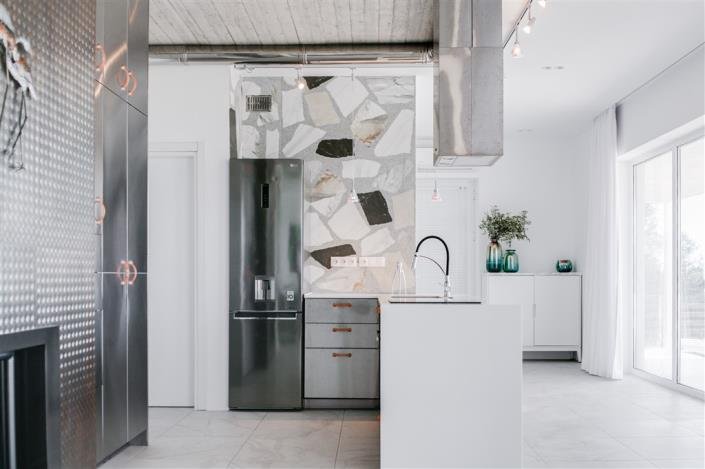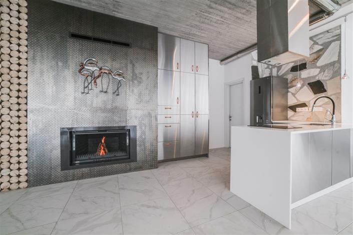 The total living area spreads over 103sqm on a single floor and features 2 bedrooms, 2 bathrooms one with a shower and the other with a bathtub, and an open plan kitchen living area with large glass sliding doors that open onto a 40sqm terrace with a 46m² heated pool with counter-current for swimming enthusiasts.