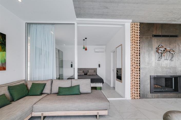 The minimal yet modern design focuses on functionality while the layout ensures that the stunning panorama is visible from the terrace, the living room, the kitchen, and master bedroom as one would not want to miss out on the everchanging picture of the yachts coming and leaving Lefkas Marina, the playful kites of the surfers in Agios Ioannis beach, the rich green hills and fields of Lefkada, the city's colorful lights in the evenings or the colony of flamingos that flock to the area.