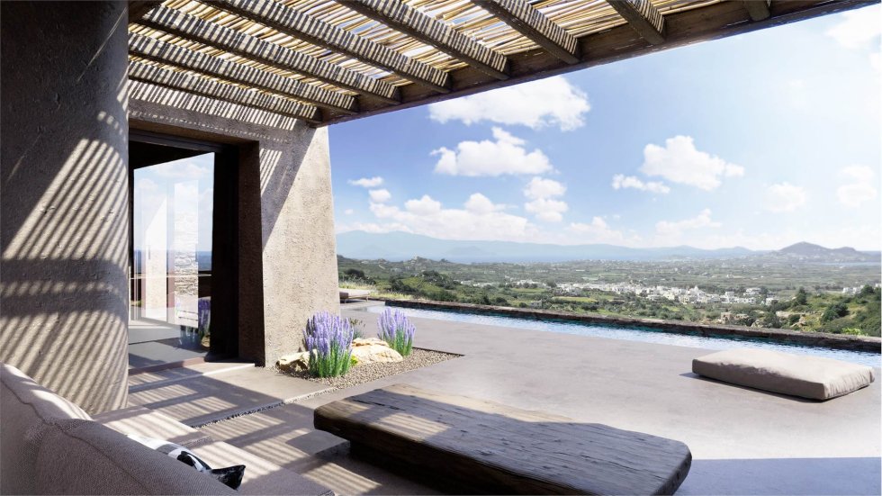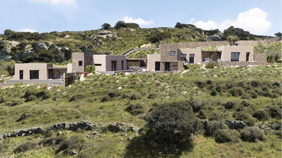 The houses harmoniously combine elements of modern and traditional Cycladic architecture, leading to a unique architectural result and design from the GFRA architects.