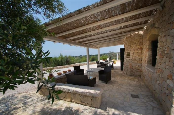 The garden is characterized by the presence of olive trees, plants such as figs, prickly pears, marine roses, lentisks, stone walls, and outcropping rocks. The whole property is fenced and usable having a flat morphological conformation, while the lands in front go downhill towards the sea, 1 km away, ensuring one of the few sea views in Salento, and an enchanting landscape.