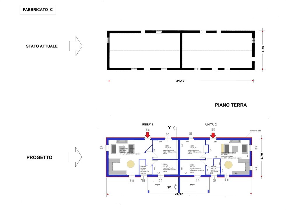 C) Building arranged on a single floor of approx. 120 to be completed, with charges for change of destination for residential use already paid.