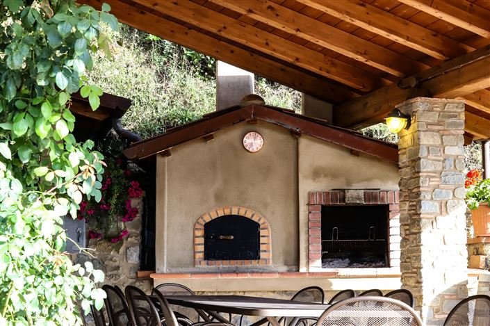 The principle door leads onto the panoramic patio and the others lead from the lounge into a covered patio with a bread oven, barbeque, and dining area. This covered area is a splendid space for summer dining.