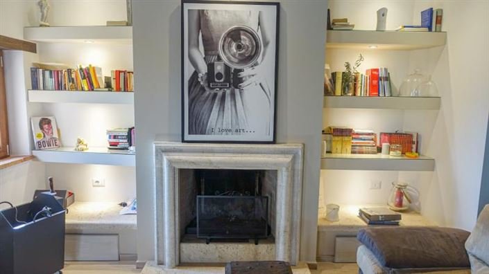 The apartment on the ground floor is divided into a large living room with a fireplace, a habitable kitchen, storage, two large double bedrooms, and a bathroom. It includes led lights and air conditioning in every room.
