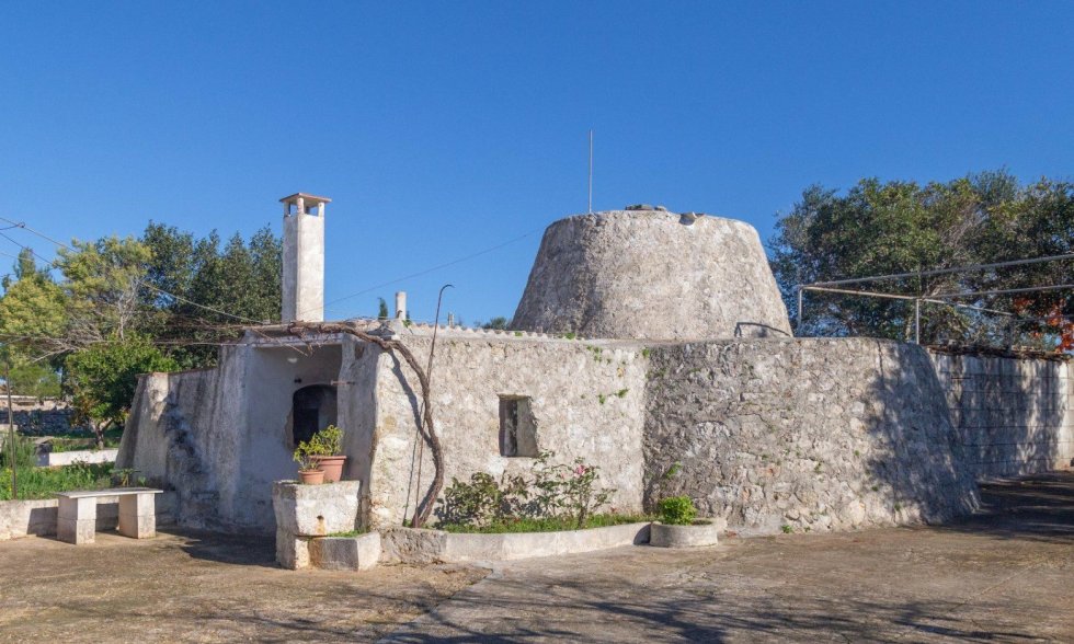 The entire property is enclosed by stone walls, and the garden is characterized by the presence of Mediterranean plants of various types, such as Olive Trees, Almonds, Figs, Prickly Pears, and Pergola of Grapes, fruit trees such as Nespole, Mandarins, Oranges, and others.