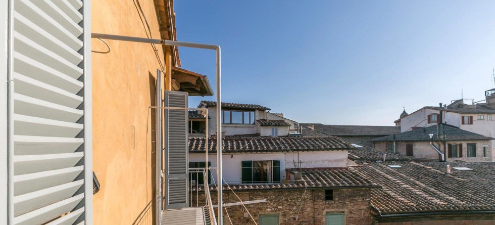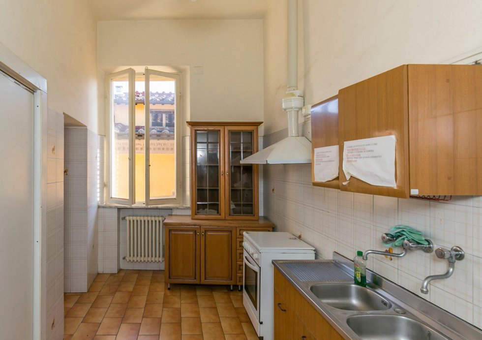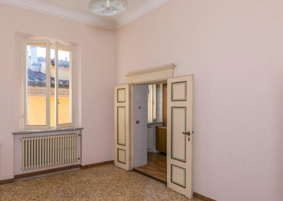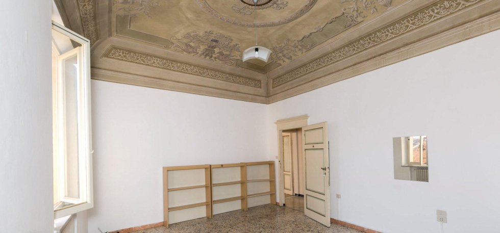 Set on the fifth floor without elevator it comprises an entrance hall, large living room with frescoed ceiling, kitchen with an adjoining dining room, master bedroom with frescoed ceiling, two single bedrooms and two bathrooms: a large one with a bathtub, the other with shower. The master bedroom and one of the single rooms have access to a panoramic balcony.