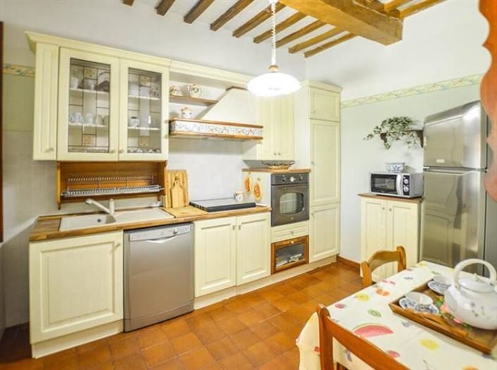 The first floor of the house then divides into two master bedrooms and two double bedrooms, mirroring one another on each side of the lounge room, all towered by traditional wooden beams in the same style as the downstairs ceiling. Two bathrooms complete this floor, although more could be added if needed. This way each bedroom could have its own private bathroom and the property might be turned into an 'agriturismo' or partly rented out.