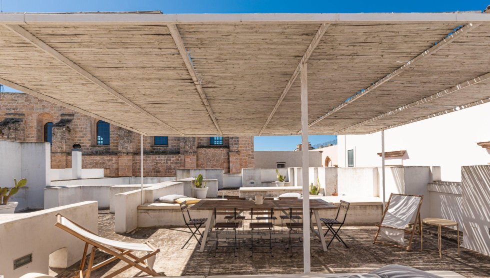 From the internal staircase that starts from the compartment of the secondary entrance, you go up to the roof terrace, equipped with various sofas, vases with prickly pears, pergolas, a barbecue with an outdoor kitchen, and a related work plan. From this terrace, you can enjoy one of the most beautiful views of the historic center of Ugento, a city of very ancient origins.